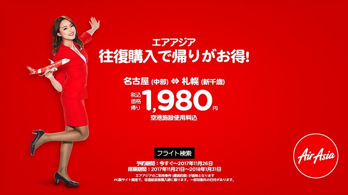 中部国際空港セントレアを拠点に運航するLCCエアアジア・ジャパン。2017年11月20日(月)より、航空券を往復で購入すると復路が1,980円になるセールを開催中です。航空券を往復で予約・購入して、魅力溢れる冬の北海道へお得に出かけてみませんか?