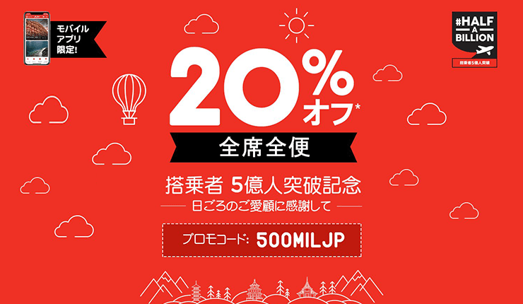 エアアジアは、2018年5月30日から2018年6月3日にかけて、モバイルアプリ限定で「全席全便20%オフセール」を開催します!!